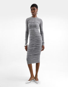 So this has meaning to it, as well as a thematic tie to the work itself. All good. The craftsmanship is impressive, as it always is with traditional Irish knitwear. Our problem with it is that we really don’t think you can make a sassy little dress with an expansive silhouette out of a traditional Aran sweater knit. We might be okay with the design if the skirt wasn’t shaped like that. In fact, with those dramatic sleeves, we’d have rather seen a more body-con skirt that went to the floor rather than this sassy little panniered thing, if only because we don’t think those white tights are working at all. But as we said, you get to make the call on this one and perhaps its charm, which is considerable, outweighs any style or design issues. Let’s hear it: