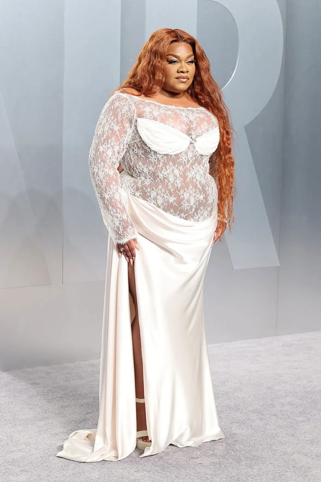 We love that she’s working a sheer lace, but it’s not enough to overcome our dislike of sheer lace on the red carpet. The bust design is especially bad.